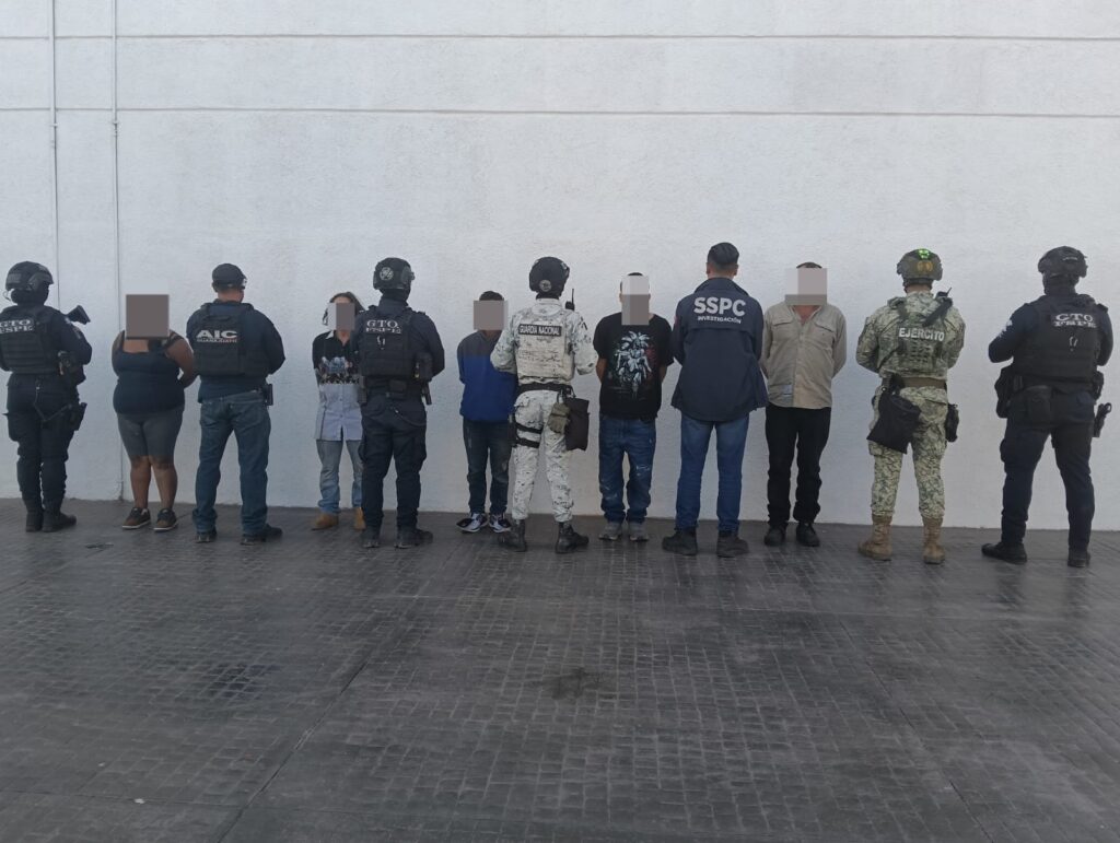 Las personas detenidas fueron identificadas como Jesús “N”, de 51 años de edad; Norma “N”, de 32 años; y Wilson “N”, de 36 años, todos con domicilio en Yuriria. Asimismo, fueron asegurados Juan Manuel “N”, de 27 años, con domicilio en el mismo municipio, y Jorge Alejandro “N”, de 40 años, residente del municipio de Celaya.