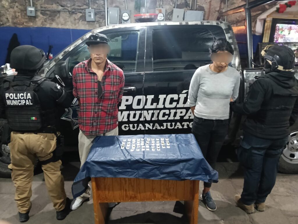 Guanajuato, Gto. En un operativo de seguridad y vigilancia, policías de la Secretaría de Seguridad Ciudadana de Guanajuato Capital detuvieron a dos personas que tenían 46 dosis de presunta droga cristal.
