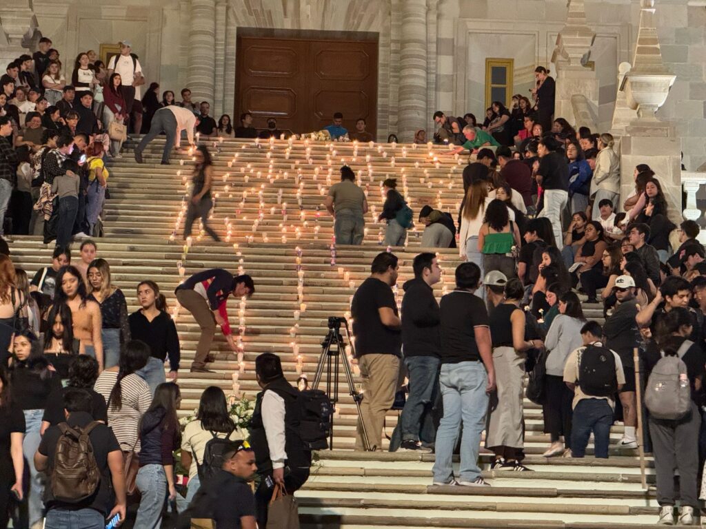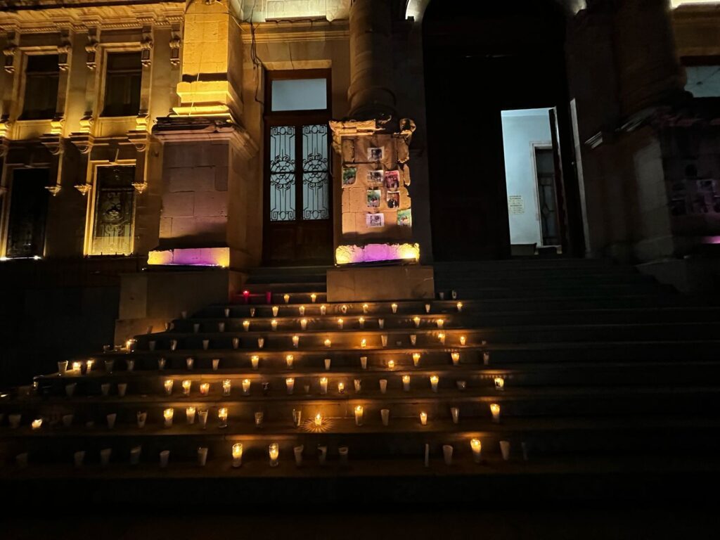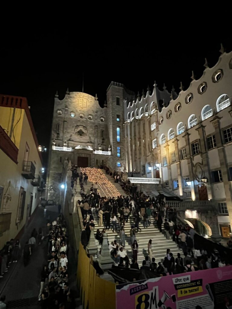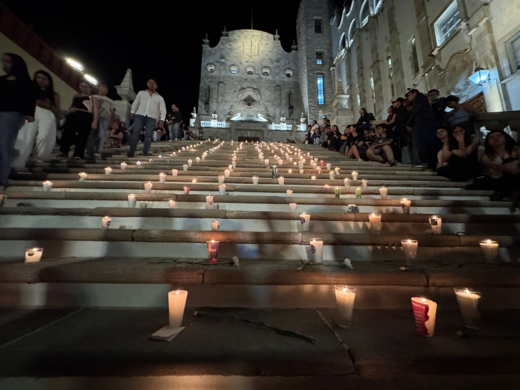 Por la noche decenas de estudiantes de la Universidad de Guanajuato, instalaron una mega una ofrenda con veladoras en las escalinatas de la máxima Casa de Estudios, en memoria de sus compañeros fallecidos.