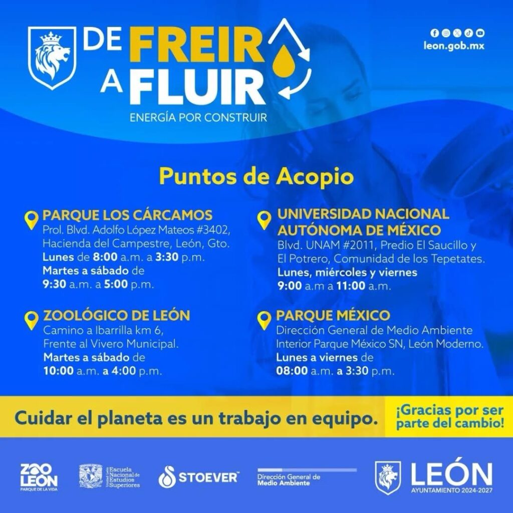 León, Guanajuato. Fueron habilitados cuatro puntos de acopio de aceite de cocina usado para procesarlo como biodiesel, esto como parte de la iniciativa, De Freír a Fluir: Energía para Construir, impulsado por la Dirección General de Medio Ambiente del Municipio de León.