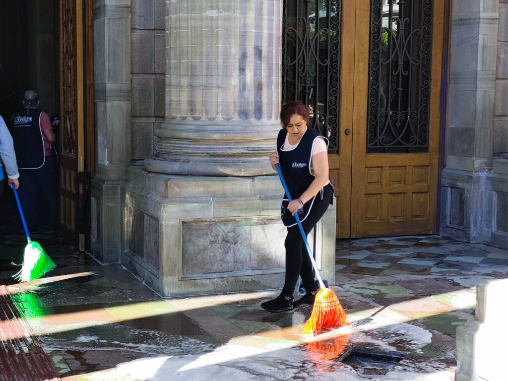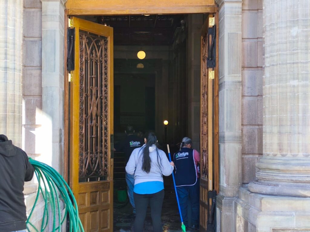 La mañana del domingo, cerca de 10 personas iniciaron la limpieza del recinto, con agua, mangueras, escobas y jabón, además de que supervisaron los datos a la puerta quemada.