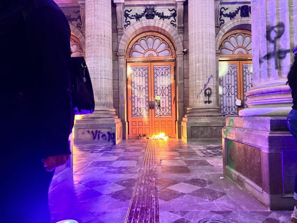 En su manifestación por la exigencia dar respuesta por las mujeres desaparecidas, por los feminicidios, así como por la justicia por todos aquellos casos de violencia hacia la mujer, el bloque negro creó varias “fogatas” para quemar las puertas del teatro.