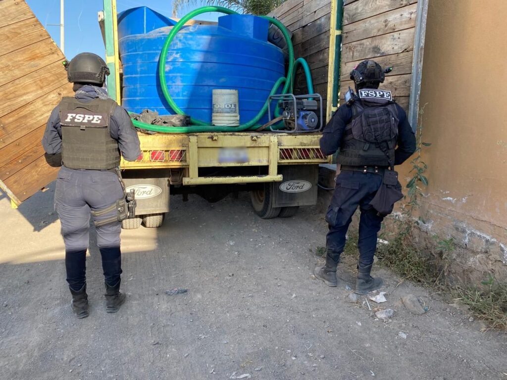 En el vehículo Ford con reporte de robo se localizó una cisterna con capacidad para 5 mil litros que contenía aproximadamente 1,000 litros de hidrocarburo de supuesta procedencia ilícita; una motobomba y una manguera de siete metros de largo, herramientas utilizadas comúnmente para la extracción y traslado ilegal de combustible.