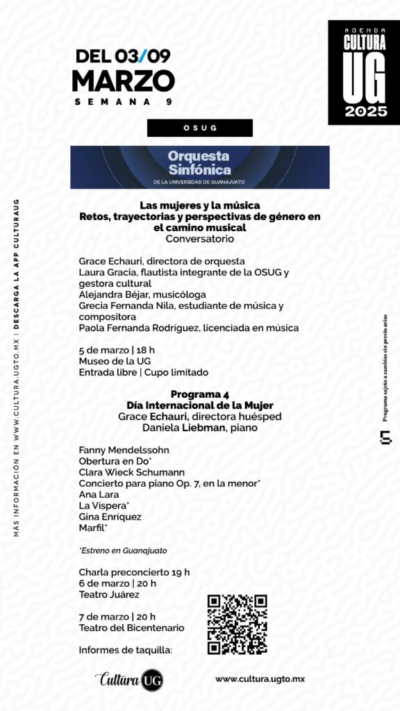 Además, el 6 de marzo a las 20:00 horas, el Teatro Juárez resonará con el talento musical de la OSUG, bajo la dirección de Grace Echauri y en compañía del talento en el piano de Daniela Liebman, con el programa “Día Internacional de la Mujer”, donde se interpretará la Obertura en Do, de Fanny Mendelssohn; el Concierto para piano Op. 7, en la menor, de Clara Wieck Schumann; y el estreno en Guanajuato de La Víspera, de Ana Lara, y Marfil, de Gina Enríquez. Este mismo programa también se podrá disfrutar el 7 de marzo a las 20:00 horas en el Teatro Bicentenario.
