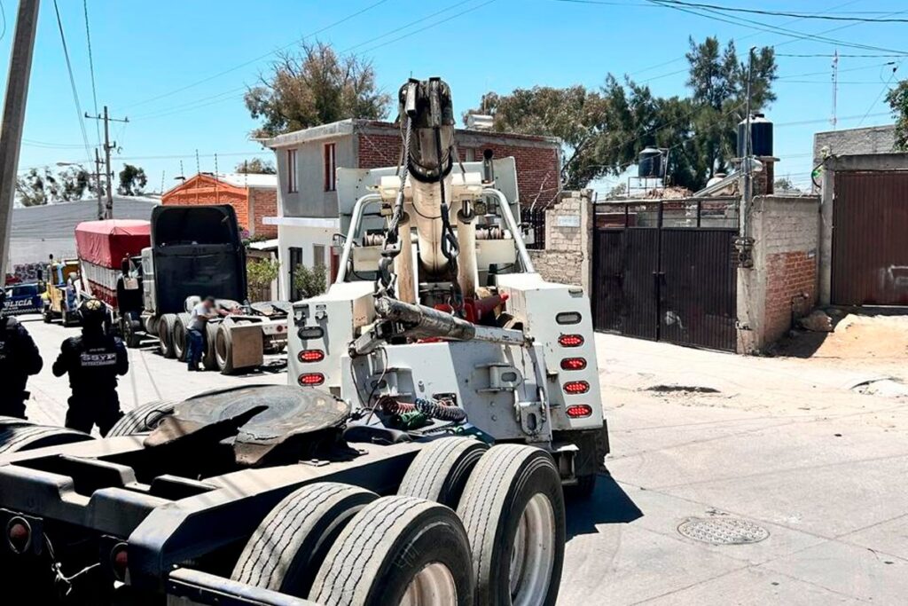 Tras el cateo llevado a cabo en el inmueble de dicha colonia fueron asegurados cuatro vehículos con reporte de robo: dos tractocamiones y dos semirremolques tipo Dolly. Estas acciones refuerzan la lucha contra el robo al transporte de carga identificado como una actividad ilícita que financia organizaciones delictivas y genera violencia en la región.