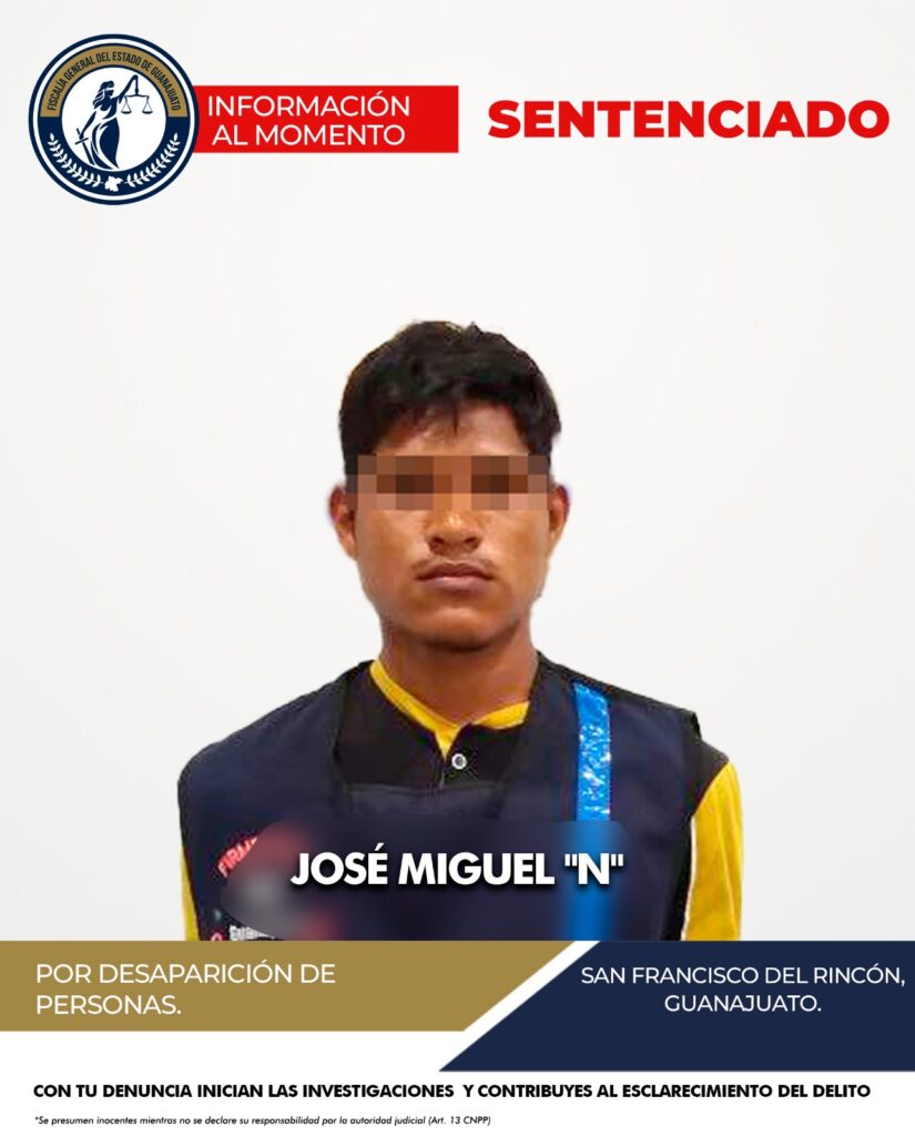 San Francisco del Rincón, Gto. Investigación de la Fiscalía resulta en sentencia de 40 años de cárcel para acusado por desaparición de personas en San Francisco del Rincón La Fiscalía General del Estado de Guanajuato logró acreditar, ante un Tribunal de juicio oral, la responsabilidad penal de JOSÉ MIGUEL “N” en el delito de desaparición de personas, cometido en agravio de un ciudadano en el municipio de San Francisco del Rincón.