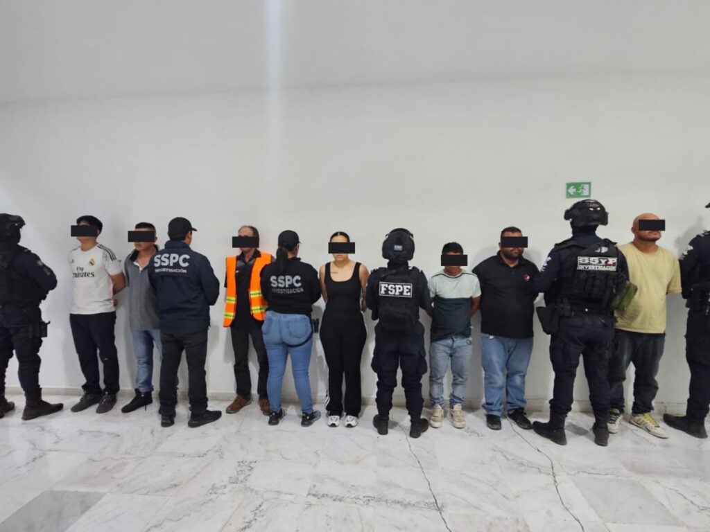 Durante el operativo fueron detenidas ocho personas —siete hombres y una mujer— identificadas como José Guadalupe “N” (75 años), José Efrén “N” (42), María Carolina “N” (27), Luis Kaleb “N” (20), Jesús Salvador “N” (32), Miguel “N” (35), Héctor Vladimir “N” (34) y Tirso “N” (74).