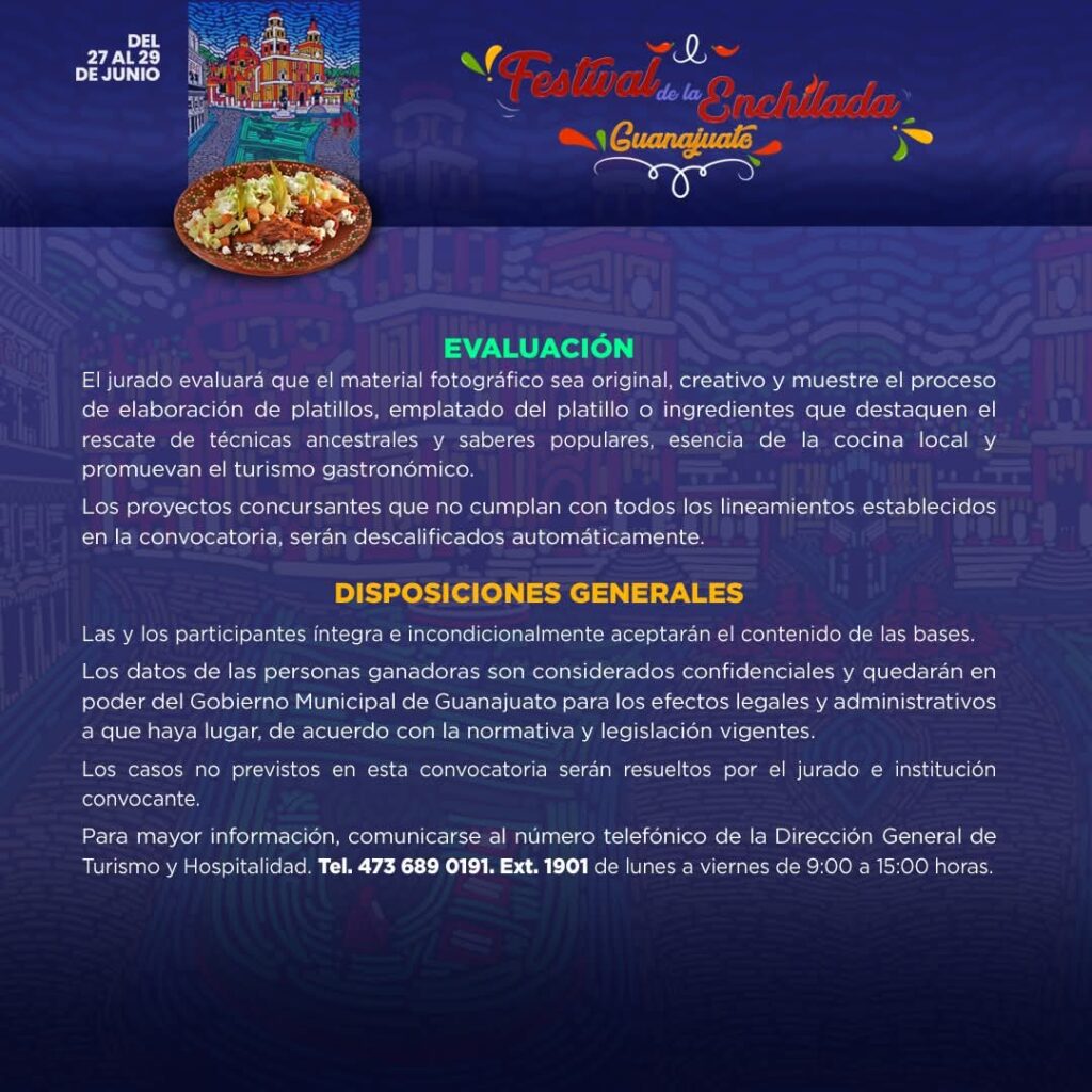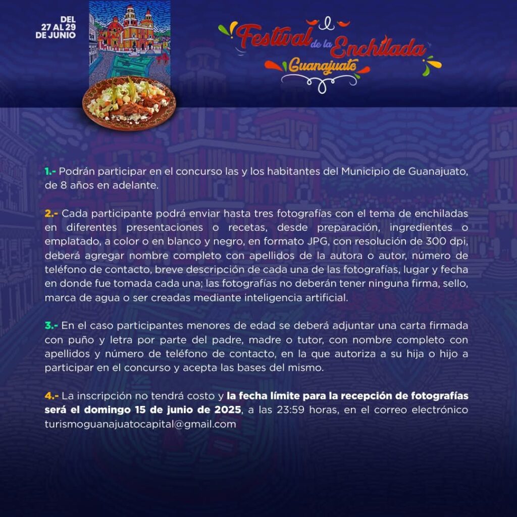 El concurso está abierto a personas habitantes de Guanajuato capital, de ocho años de edad en adelante; cada participante puede postular hasta tres fotografías en formato color o blanco y negro, de todo tipo de recetas de enchiladas. Durante el festival se expondrán las fotografías en el jardín Unión.
