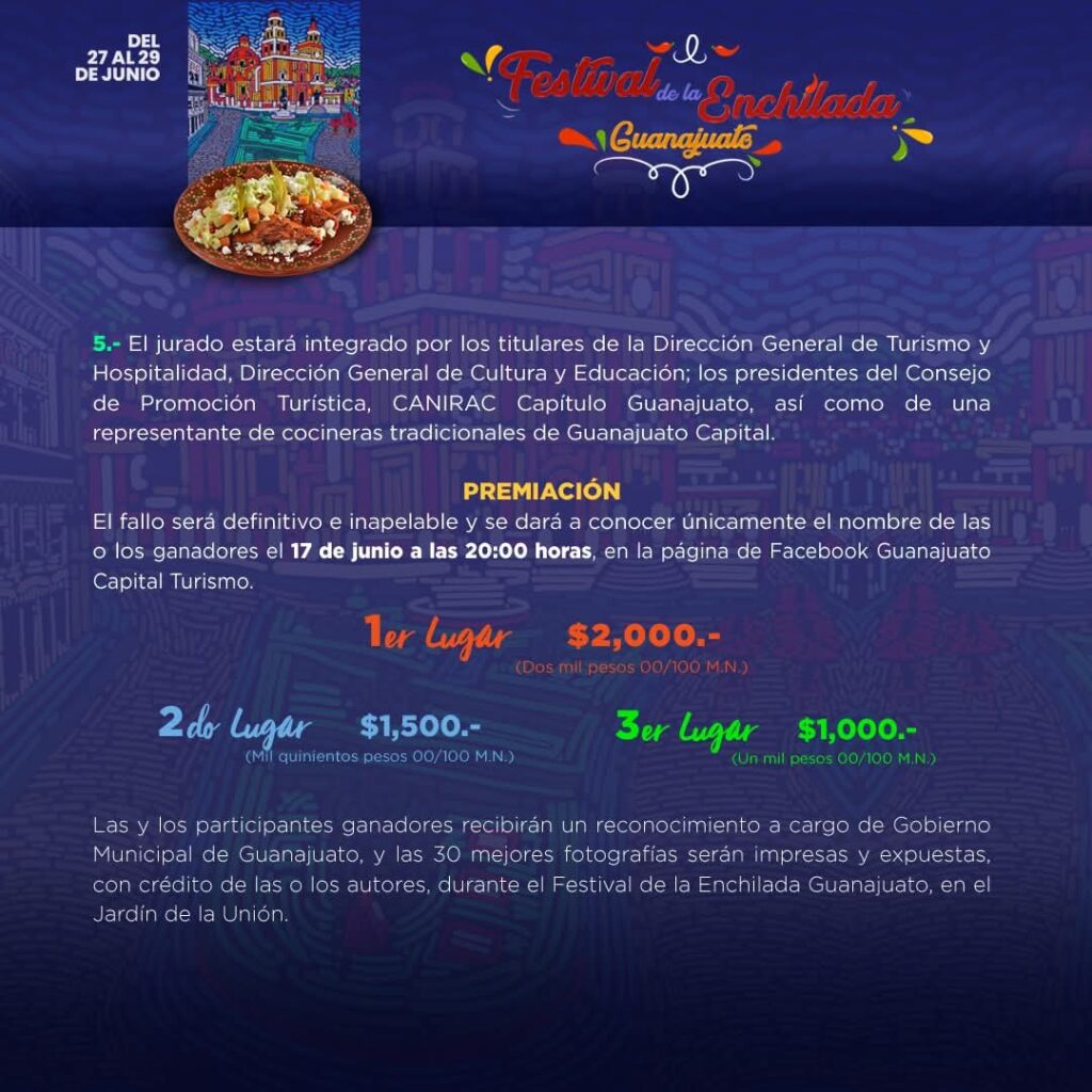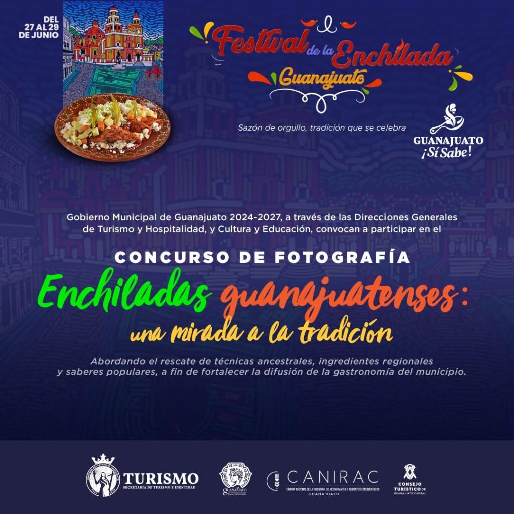 Guanajuato, Gto. El Gobierno Municipal a través de la Dirección General de Turismo y Hospitalidad invita a las personas apasionadas de la fotografía y de los platillos tradicionales, a participar en el Concurso de Fotografía “Enchiladas guanajuatenses, una mirada a la tradición”.