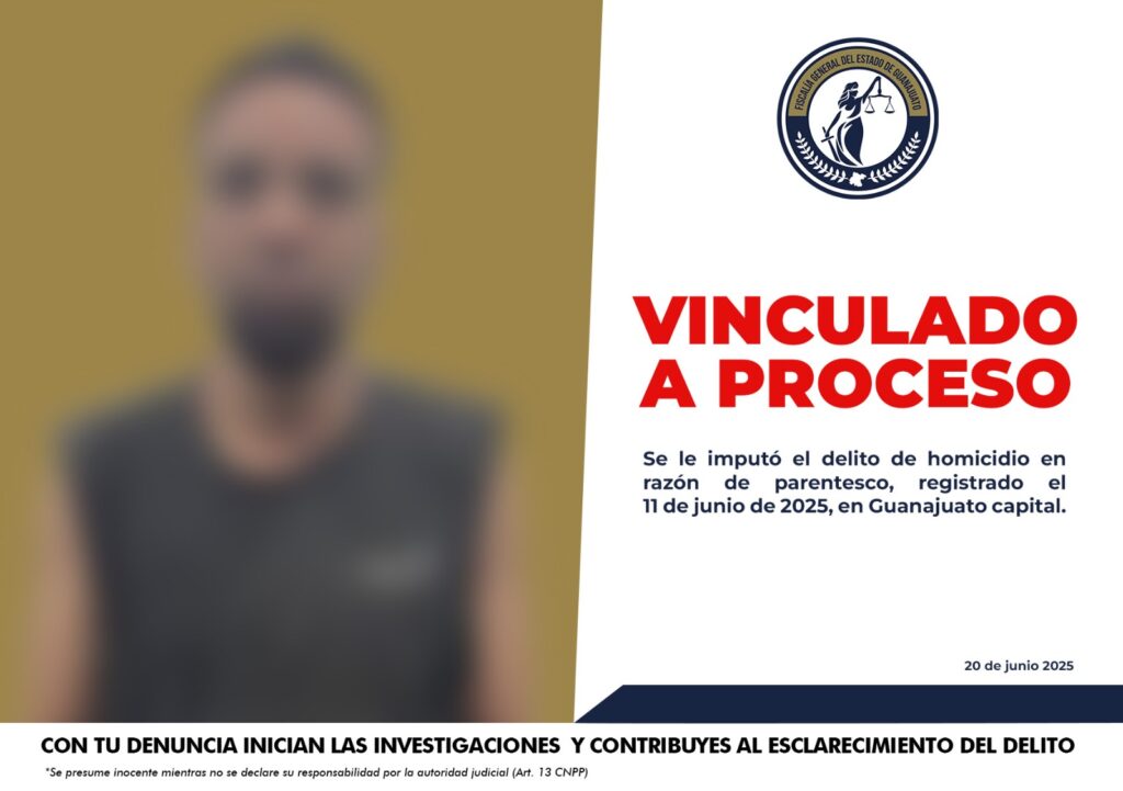 Guanajuato, Gto. La Fiscalía General del Estado llevó ante un Juez a un sujeto de 30 años por su probable responsabilidad en el asesinato de su padre, ocurrido en el municipio de Guanajuato. Como resultado de la investigación, este sujeto ya se encuentra en prisión por el delito de homicidio en razón de parentesco.