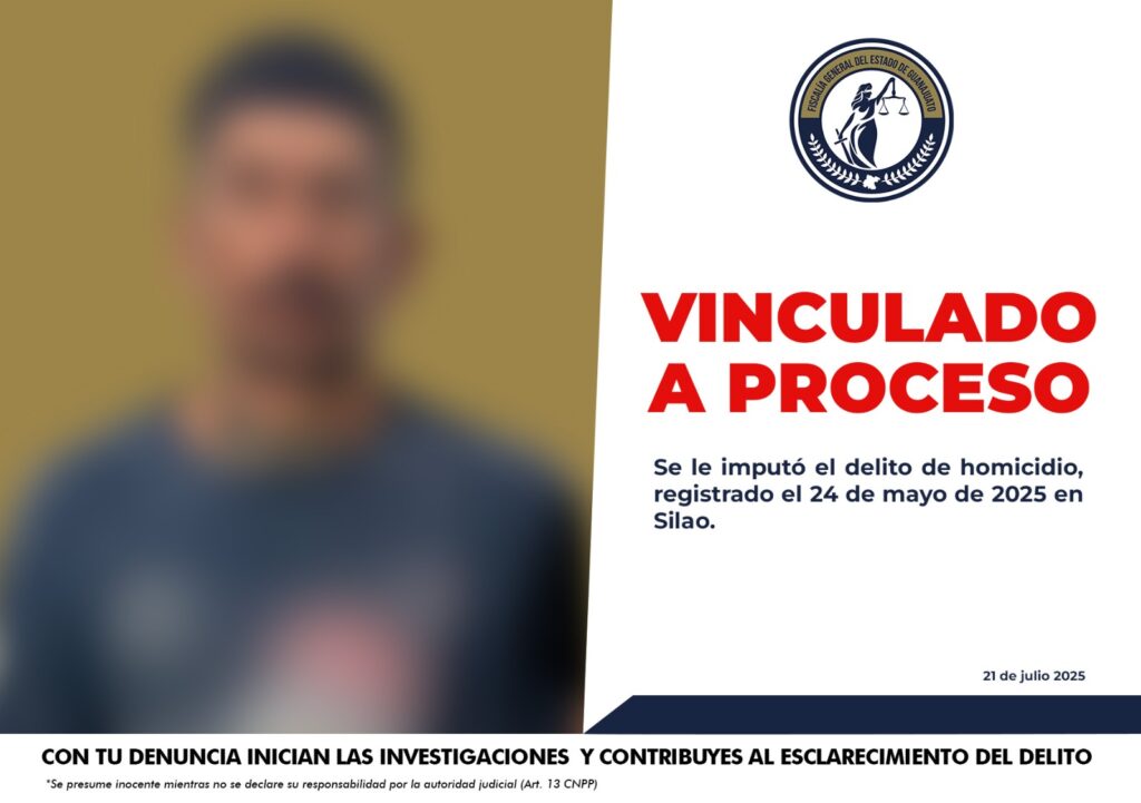 Silao, Gto. La Fiscalía General del Estado de Guanajuato informa que, derivado de los hechos ocurridos el 24 de mayo de 2025, fue vinculado a proceso Armando “N”, alias «el mandingo», por su probable participación en el delito de homicidio.