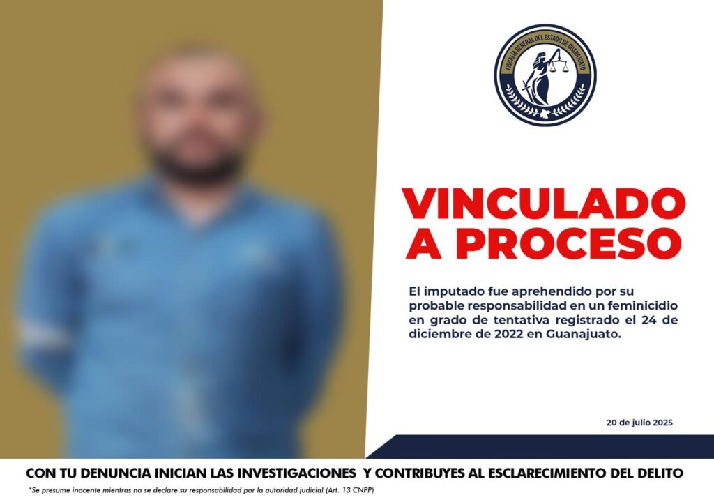 Guanajuato, Gto. La Fiscalía General del Estado de Guanajuato informa que, como resultado de las investigaciones realizadas por personal ministerial, pericial y policial, se logró la vinculación a proceso penal de Andrés Salvador “N” por su probable responsabilidad en el delito de feminicidio en grado de tentativa, en agravio de una mujer con quien mantenía una relación sentimental.