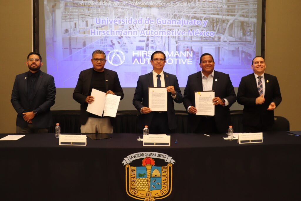 Guanajuato, Gto.- Autoridades universitarias, encabezadas por el Dr. Martín Picón Núñez, Rector del Campus Guanajuato de la Universidad de Guanajuato (UG), signaron un convenio de colaboración con la empresa Hirschmann Automotive México para prácticas profesionales, servicio social, proyectos interdisciplinarios de vinculación de la comunidad universitaria y bolsa de trabajo.
