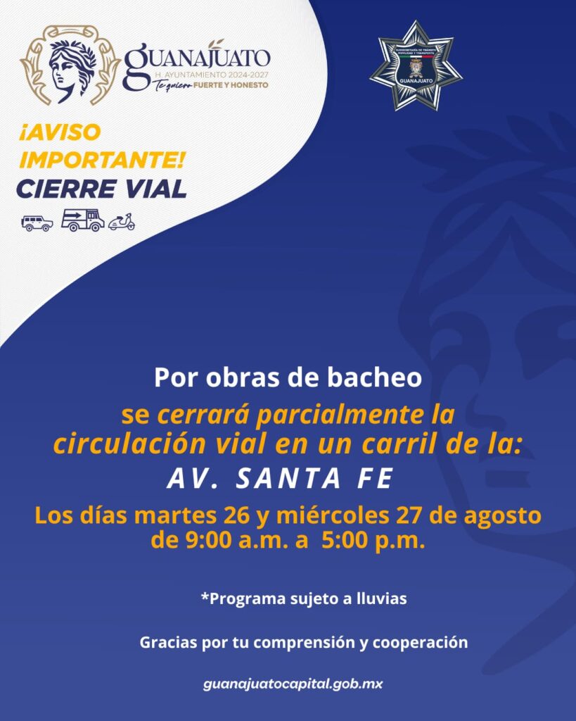 Guanajuato, Gto. Debido al inicio de trabajos de mantenimiento y bacheo preventivo, a partir del martes 26 de agosto se realizarán cierres parciales en la avenida Santa Fe.