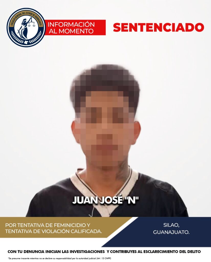 Silao, Gto. La Fiscalía General del Estado obtuvo una sentencia condenatoria de 25 años de prisión contra JUAN JOSÉ “N”, al acreditarse su responsabilidad en los delitos de tentativa de feminicidio y tentativa de violación calificada, en agravio de una víctima en el municipio de Silao.