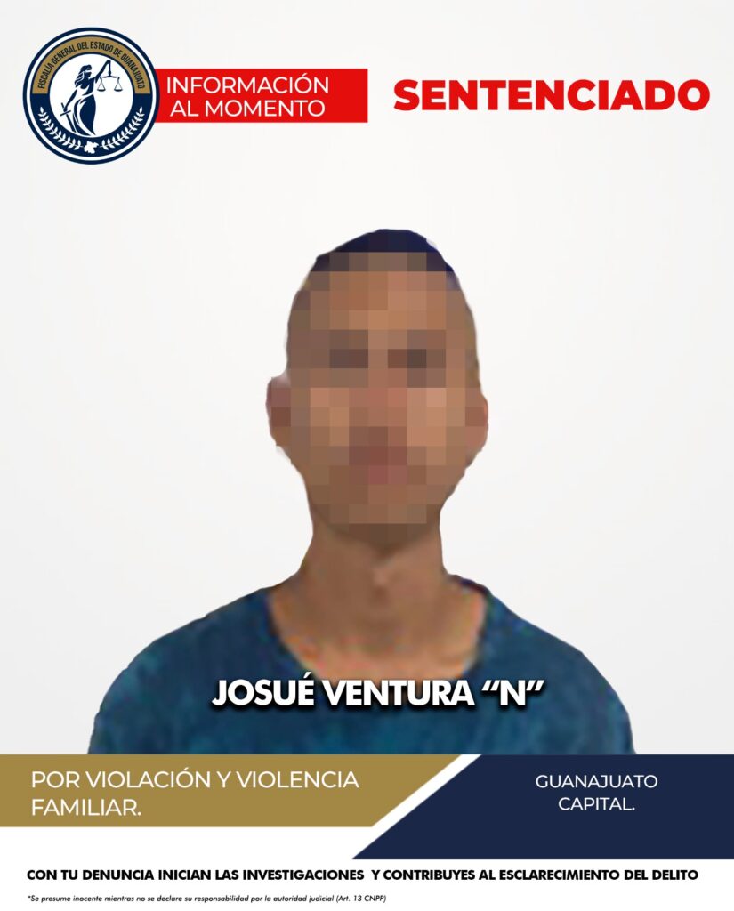 Guanajuato, Gto. La Fiscalía General del Estado logró que un juez dictara una sentencia condenatoria de 7 años y 15 días de prisión en contra de JOSUÉ VENTURA “N”, encontrado culpable por los delitos de violencia familiar y violación, cometidos en agravio de una víctima, dentro de un contexto de violencia