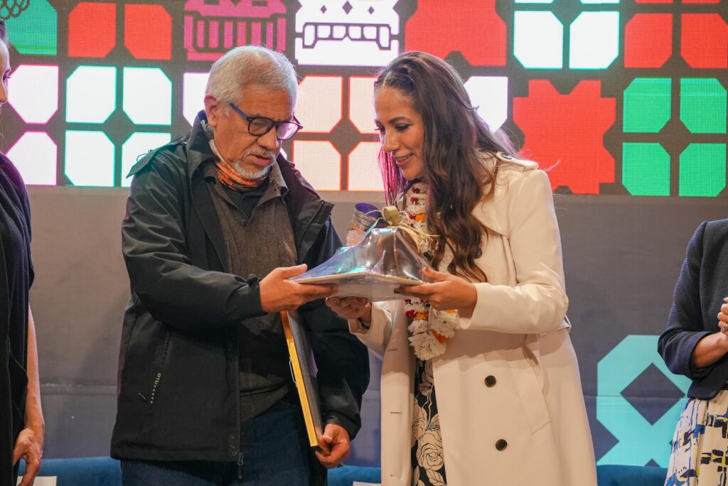 También las autoridades reconocieron a Petrona de la Cruz Cruz con la entrega de la Presea Cervantina, destacando su labor en el arte y el teatro indígena contemporáneo.