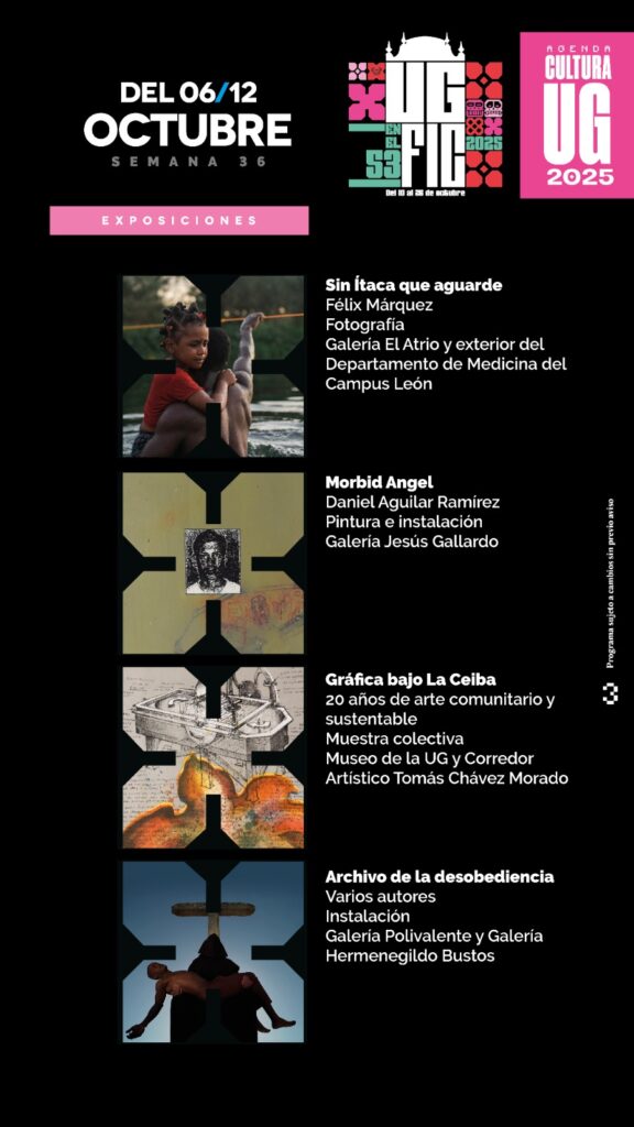 La muestra de Daniel Aguilar Ramírez, “Morbid Angel”, pintura e instalación, se hallará en la Galería “Jesús Gallardo”; mientras que la muestra colectiva “Gráfica bajo La Ceiba”, 20 años de arte comunitario y sustentable, estará disponible en el Museo de la UG (MUG) y el Corredor Artístico “Tomás Chávez Morado”. Además, “Archivo de la desobediencia”, instalación de varios autores, podrá contemplarse en la Galería Polivalente y la Galería “Hermenegildo Bustos”.