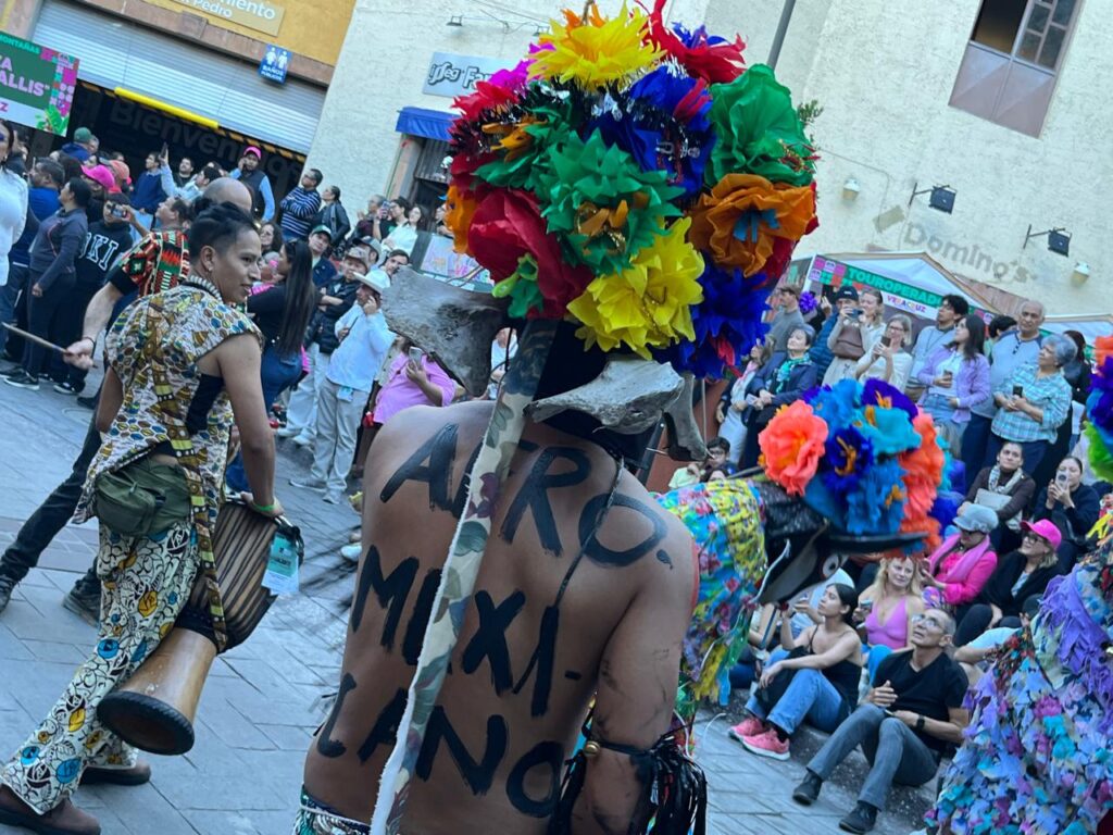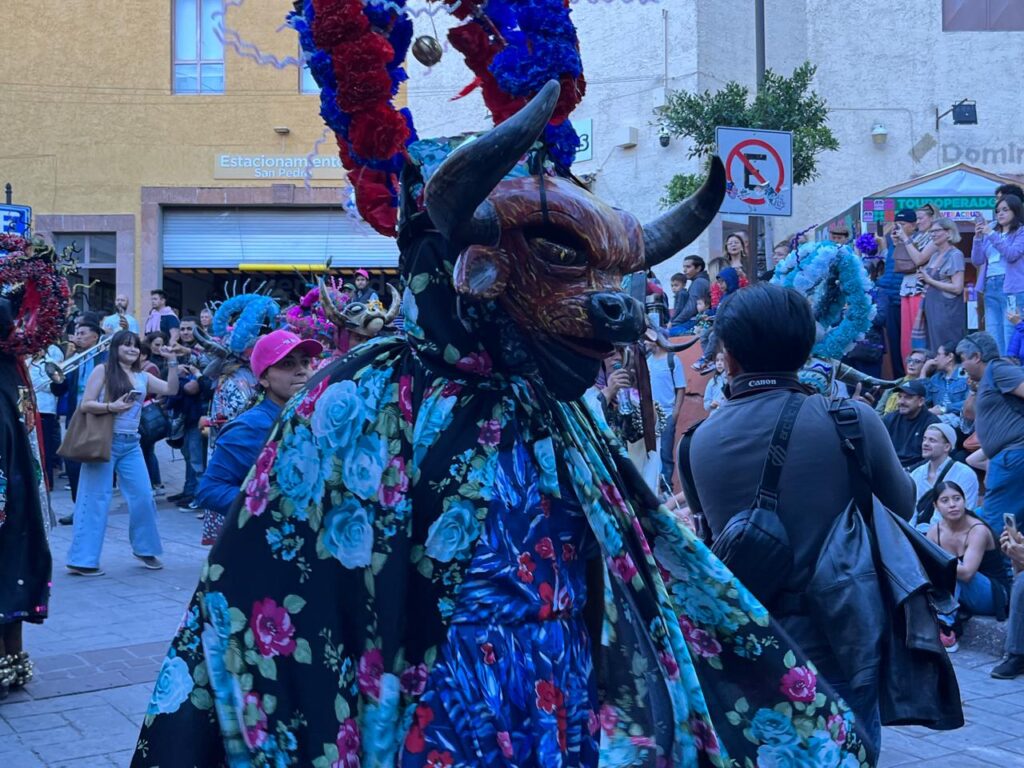 Los Toros de Coyolillo, personas con largas túnicas floreadas y máscaras de toros decoradas con un tocado floral, dejaron todo en las adoquinadas calles de la capital mientras danzaban al ritmo de la banda de viento, pero el baile no fue propio de la comparsa, pues a su paso, hicieron a las guanajuatenses parte del festejo al sacarlas a bailar.