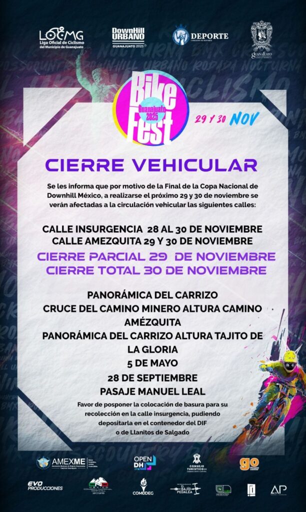 Guanajuato, Gto. Debido a la realización del Bike Fest Guanajuato 2025 y a la carrera con causa “Camina, Trota y Corre hacia la Inclusión”, este fin de semana se contemplan diversos cierres vehiculares en varios puntos de la ciudad.