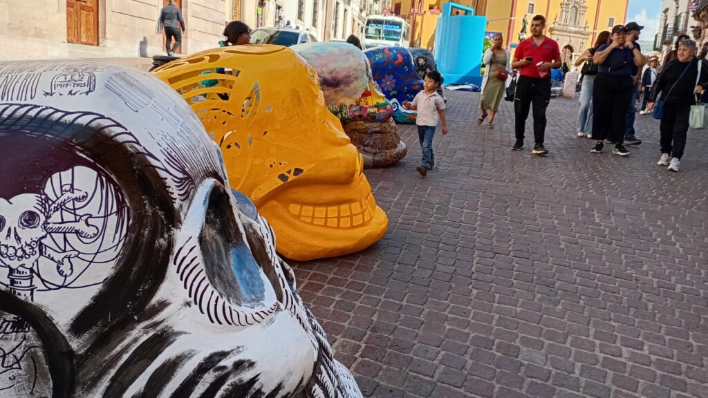 Guanajuato, Gto.- Desde el pasado 29 de octubre y hasta el 2 de noviembre, artistas de la Universidad de Guanajuato (UG) expusieron en las calles de la ciudad capital (Avenida Juárez y subterránea) un proyecto colectivo de intervención pictórica sobre esculturas de cráneos en gran formato.