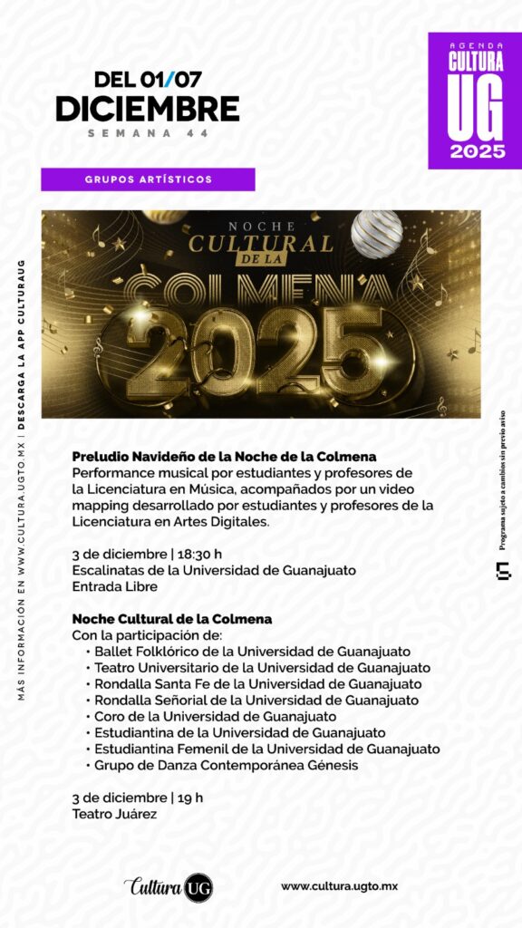 La tradicional “Noche Cultural de la Colmena” llegará el 3 de diciembre con dos actividades especiales. A las 18:25 horas, las Escalinatas de la UG serán escenario del “Preludio Navideño”, un performance musical interpretado por estudiantes del Departamento de Música y Artes Escénicas (DEMAE), bajo la guía de la Mtra. Fabiola Venegas, acompañados por un videomapping creado por estudiantes de la Licenciatura en Artes Digitales.