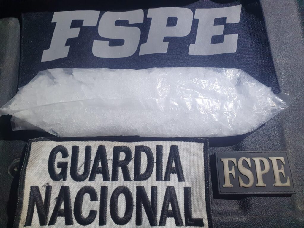 Luego de efectuar una inspección preventiva, se le aseguró una bolsa plástica que contenía una sustancia granulada (presunto cristal) con un peso aproximado de 182 gramos, equivalente a las 548 dosis. Además, se le localizó un chaleco táctico color negro, sin placas balísticas y se aseguró un vehículo Nissan Tsuru.