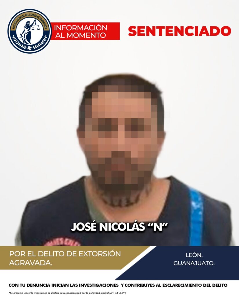 León, Gto. La Fiscalía General del Estado a través de un Agente del Ministerio Público Especializado en materia de Desaparición Forzada de Personas, Desaparición Cometida por Particulares y del Sistema Nacional de Búsqueda de Personas, logró que un juez dictara 15 años de prisión en contra de JOSÉ NICOLÁS “N”, por el delito de extorsión agravada en León.