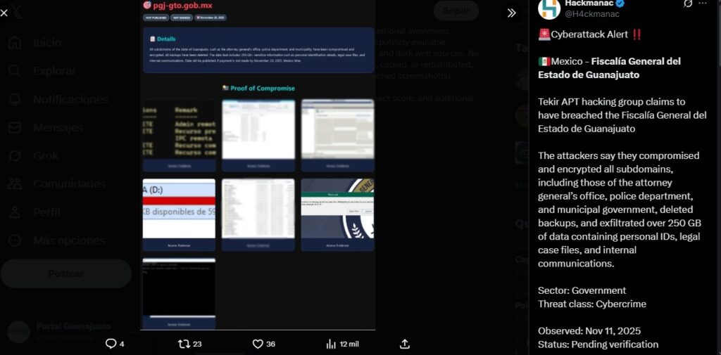 La mañana de ayer la cuenta de X, Hackmanac (@H4ckmanac), dedicada al seguimiento de ciberataques reales registrados en diferentes partes del mundo, informó sobre el presunto hackeo a la Fiscalía de Guanajuato, con el que habrían extraído alrededor de 250 gigabytes de información.