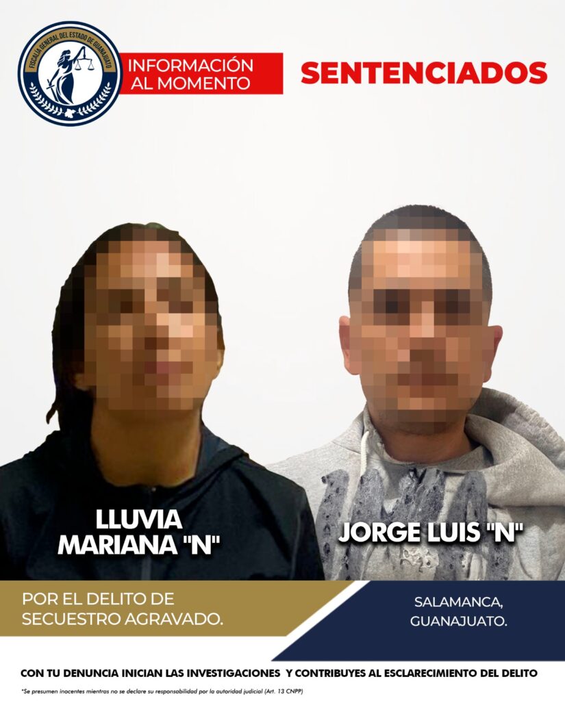 Salamanca, Gto. Un agente del Ministerio Público de la Fiscalía Especializada en Investigación de Delitos de Alto Impacto (FEIDAI), logró que un Tribunal de Enjuiciamiento dictara una sentencia 95 años de prisión contra LLUVIA MARIANA “N” y JORGE LUIS “N”, responsables del delito de secuestro agravado en el municipio de Salamanca.