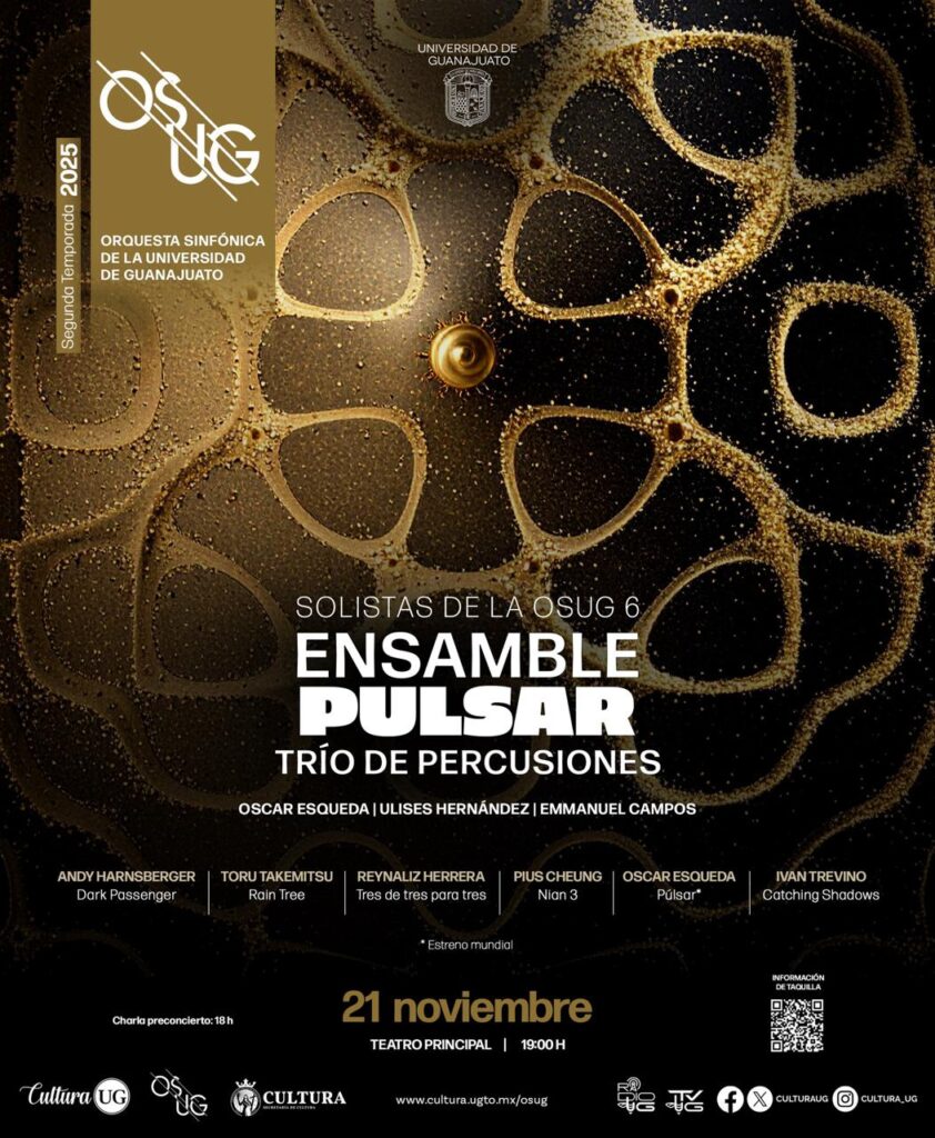 De acuerdo al comunicado de prensa, ayer las 19:00 horas en el Teatro Principal, el Ensamble Pulsar, trío de percusiones, conformado por Óscar Esqueda, Ulises Hernández y Emmanuel Campos, explorará numerosas posibilidades de la música de vanguardia con piezas de Andy Harnsberger, Toru Takemitsu, Reynaliz Herrera, Pius Cheung, Ivan Trevino y un estreno mundial del mismo Óscar Esqueda, timbalista principal de la OSUG.