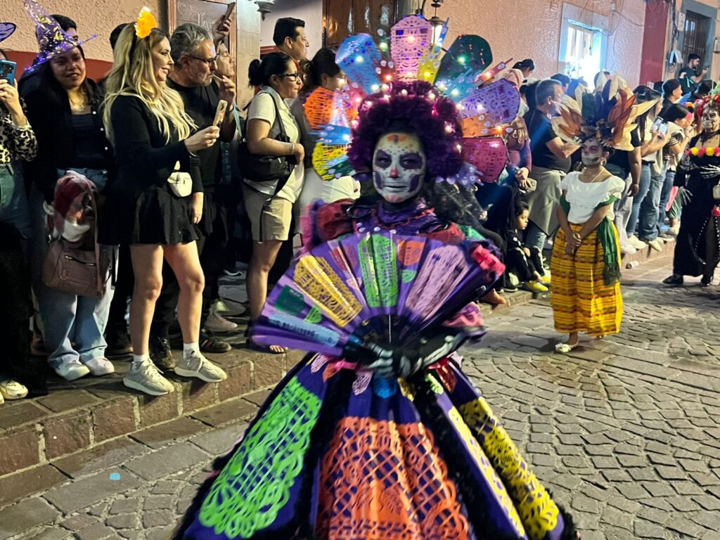 Resaltaron las calacas mojigangas, así como de personajes de películas tradicionales mexicanas, que al ritmo de música típica bailaron y prendieron el desfile.