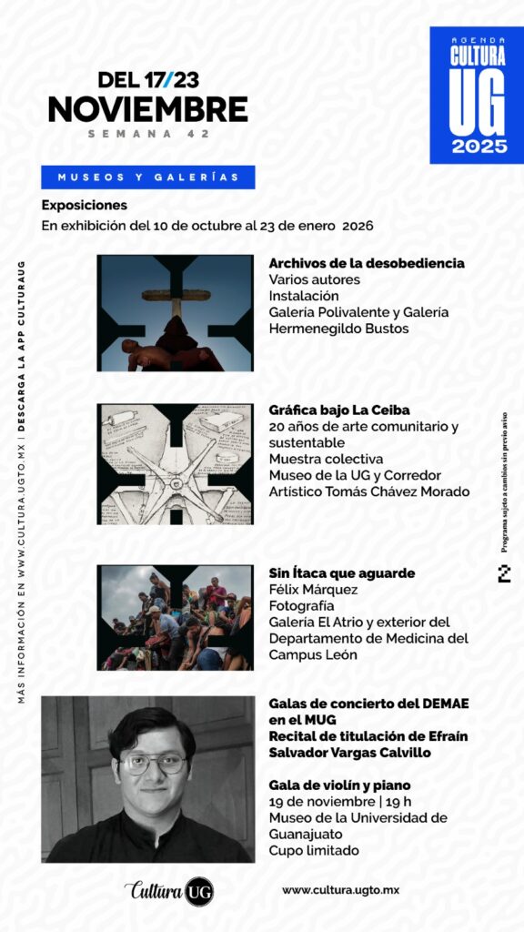 En el Museo de la UG (MUG) y el Corredor Artístico “Tomás Chávez Morado”, la exposición “Gráfica bajo La Ceiba: 20 años de arte comunitario y sustentable” celebra dos décadas de creación colectiva. Por su parte, el fotógrafo Félix Márquez exhibe “Sin Ítaca que aguarde”, una mirada poética sobre el viaje y la identidad, disponible en la Galería El Atrio y el exterior del Departamento de Medicina del Campus León.