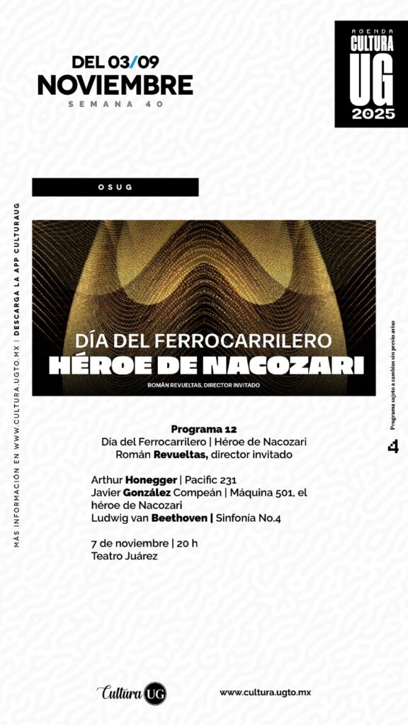 La Orquesta Sinfónica de la Universidad de Guanajuato (OSUG) se presentará con el programa 12, titulado Día del Ferrocarrilero: Héroe de Nacozari, se presentará el 7 de noviembre a las 20:00 horas en el Teatro Juárez bajo la dirección de Román Revueltas. El concierto incluirá obras de Honegger, González Compeán y Beethoven, en homenaje a la fuerza y valentía del espíritu ferroviario.