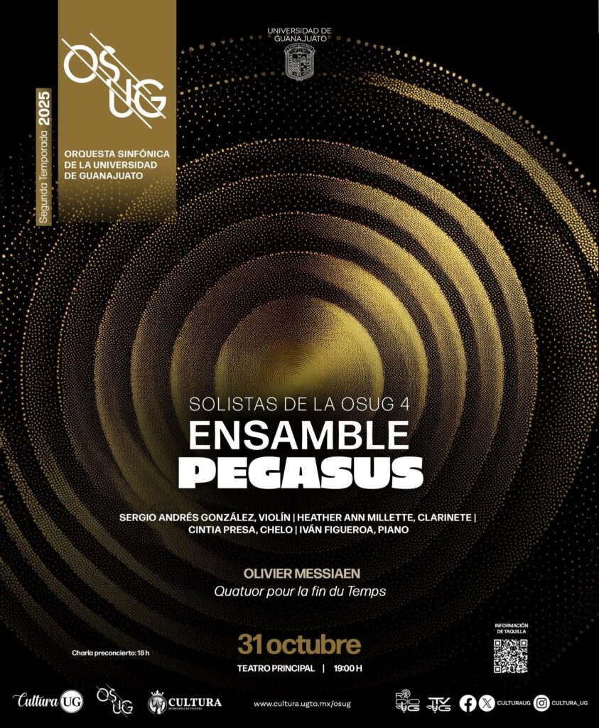 En contraste con este ambiente musical, este viernes 31 de octubre, el Teatro Principal será el recinto indicado para resaltar el talento y la solemnidad del Ensamble Pegasus, integrado por Sergio Andrés González (violín), Heather Ann Millette (clarinete), Cintia Presa (chelo) e Iván Figueroa (piano), quienes interpretaron el Cuarteto para el fin del Tiempo, del francés Olivier Messiaen.
