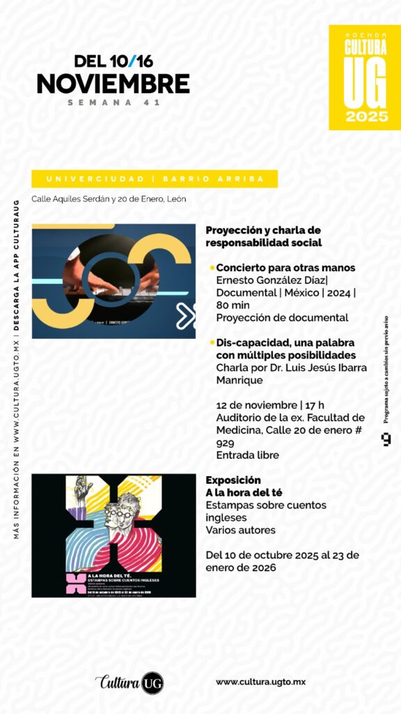 El 12 de noviembre a partir de las 17:00 horas, el público podrá disfrutar del documental Concierto para otras manos y la charla “Dis-capacidad,una palabra con múltiples posibilidades”, a cargo del Dr. Luis Jesús Ibarra Manrique. Además, continúa la exposición “A la hora del té”, una muestra de estampas inspiradas en cuentos ingleses.