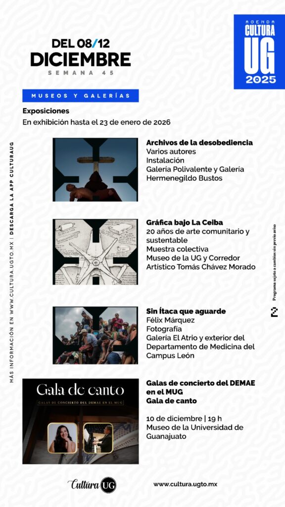 De acuerdo al comunicado de prensa, continúan en exhibición, hasta el 23 de enero de 2026, diversas muestras que reúnen propuestas contemporáneas, obra gráfica y fotografía en los recintos culturales de la Universidad de Guanajuato.