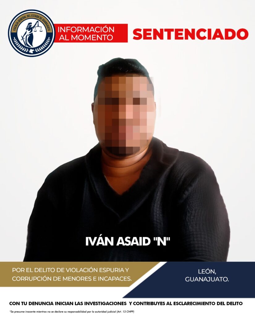León, Gto. La Fiscalía General del Estado de Guanajuato, a través de un trabajo profesional y coordinado, y en estrecha colaboración con la Fiscalía Especializada en Investigación de Delitos cometidos en contra de Mujeres por Razones de Género, obtuvo una sentencia condenatoria de 22 años de prisión en contra de IVÁN ASAID “N”, responsable de los delitos de violación espuria y corrupción de menores e incapaces, cometidos en el municipio de León.