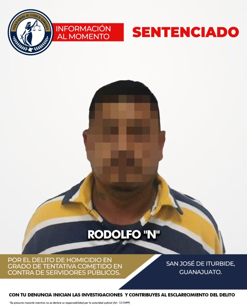 San José Iturbide, Gto. En juicio oral, la Fiscalía General del Estado de Guanajuato obtuvo una sentencia condenatoria de 60 años de prisión en contra de RODOLFO “N”, responsable del delito de homicidio en grado de tentativa cometido en agravio de servidores públicos, en hechos ocurridos en el municipio de
