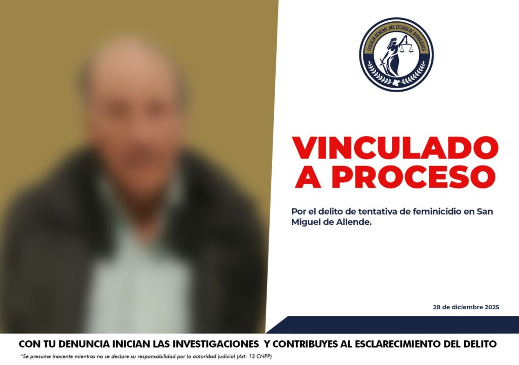 proceso de GERARDO “N”, como presunto responsable del delito de feminicidio en grado de tentativa, tras los hechos violentos registrados el pasado 25 de diciembre de 2025 en la comunidad Puente del Carmen, en San Miguel de Allende.