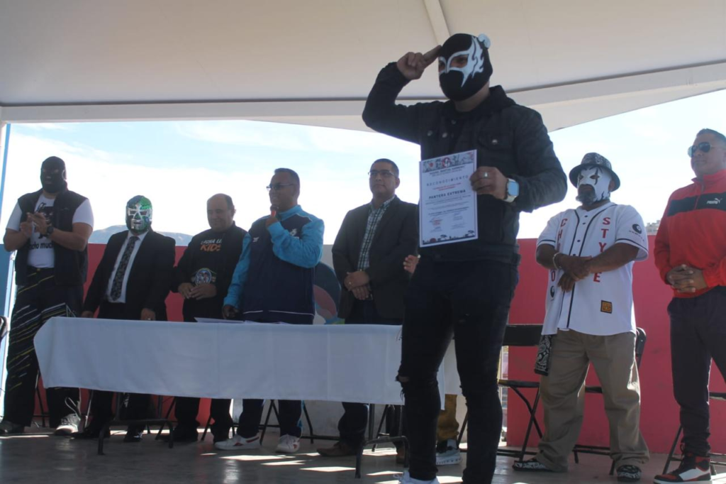 A nombre de la comunidad de Lucha Libre, el luchador Veneno hizo entrega de un reconocimiento al Sensei Martin José González González.