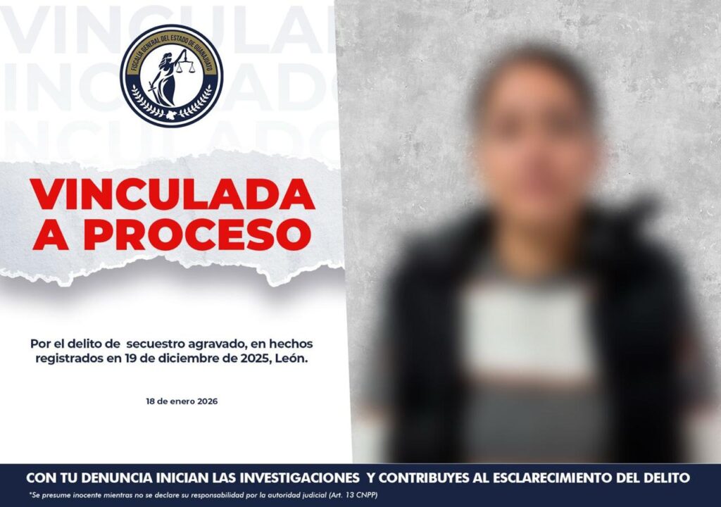 León, Gto. La Fiscalía General del Estado de Guanajuato informa que, como resultado del trabajo de investigación especializado y coordinado, se logró obtener la vinculación a proceso de JESSICA ELIZABETH “N” por su probable responsabilidad en el delito de secuestro agravado, en agravio de una persona originaria del estado de Zacatecas.