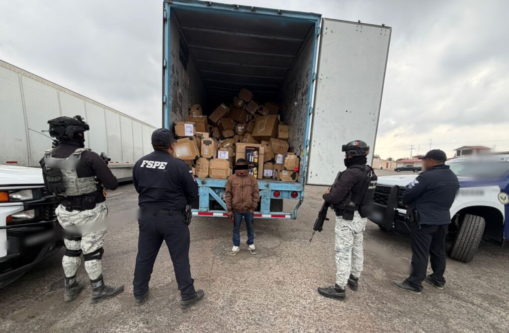 En el lugar, personal operativo tuvo contacto con un tractocamión marca Peterbilt, modelo 2016, acoplado a un semirremolque tipo caja seca, color blanco, con placas del estado de Maine, Estados Unidos. Los oficiales detectaron que la unidad transportaba mercancía originaria de China con un valor estimado de 3.5 millones de pesos.