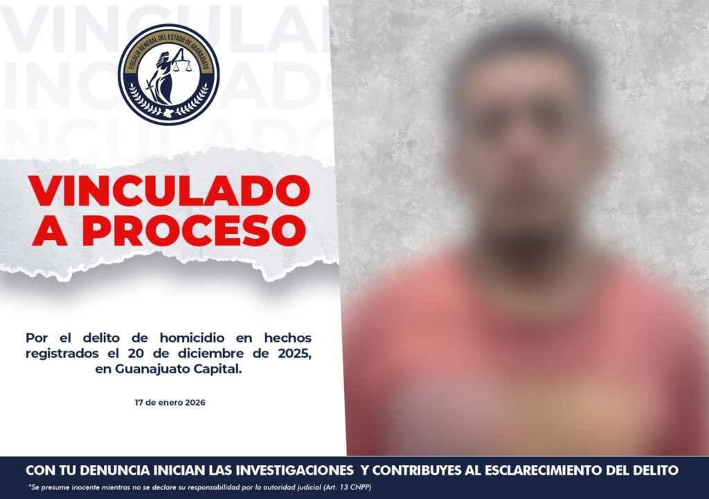 Guanajuato, Gto. La Fiscalía General del Estado de Guanajuato dio a conocer que, como resultado de las diligencias realizadas por el Ministerio Público, se obtuvo la vinculación a proceso de CARLOS OBED “N”, a quien se le atribuye su probable participación en el delito de homicidio, cometido en la ciudad
