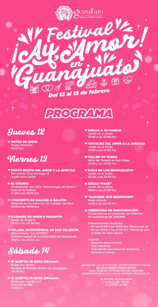 “Todas estas actividades son dentro del “Festival Ay Amor, Guanajuato” con la intención de atraer turismo, las actividades empezarán desde el viernes y concluirán el domingo, Guanajuato, no solo se visita, Guanajuato se siente y además enamora”, comentó.