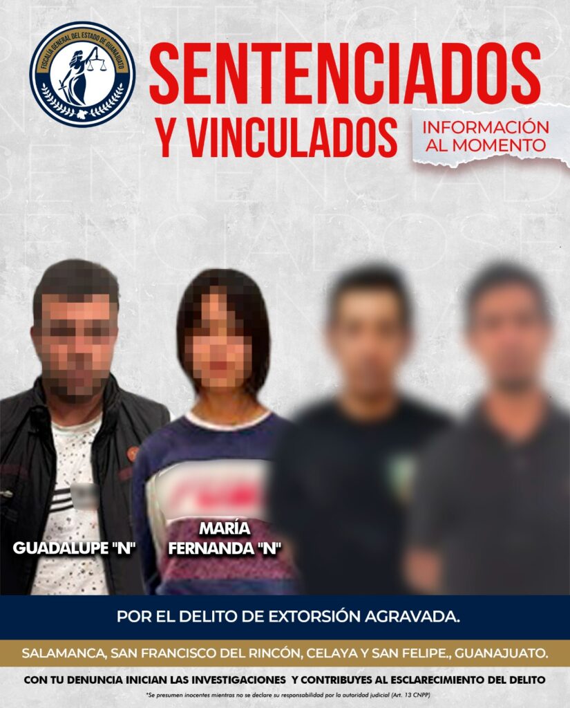 En un caso distinto, MARÍA FERNANDA “N” también fue enviada a prisión tras acreditarse su participación en la extorsión a una notaría en San Francisco del Rincón. En dicho evento, se realizaron disparos de arma de fuego al interior del establecimiento para intimidar a los afectados y forzar la