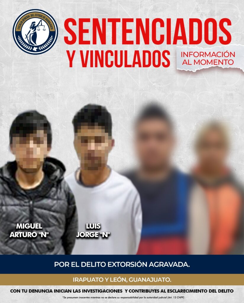 Irapuato, Gto. La Fiscalía General del Estado de Guanajuato informa sobre importantes avances en la investigación y sanción de delitos de extorsión agravada, logrando en días recientes sentencias condenatorias y vinculaciones a proceso en contra de varios imputados por estos delitos ocurridos en los municipios de Irapuato y León.