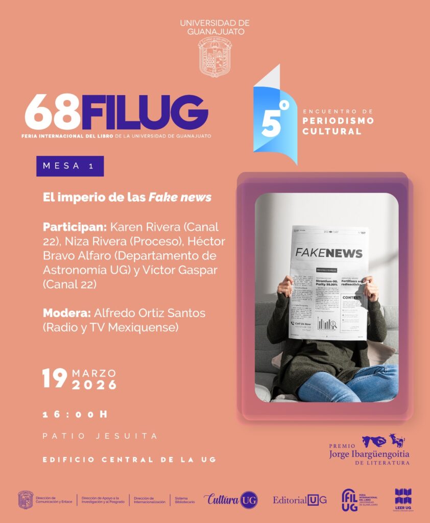 Posteriormente, a las 16:00 horas en el Patio Jesuita, se desarrollará la primera mesa de análisis, “El imperio de las fake news”, con la participación de Niza Rivera (Proceso), Karen Rivera (Canal 22), Víctor Gaspar (Canal 22), además de la intervención de Héctor Bravo Alfaro, académico del Departamento de Astronomía de la UG; la moderación estará a cargo de Alfredo Ortiz Santos (Radio y TV Mexiquense).