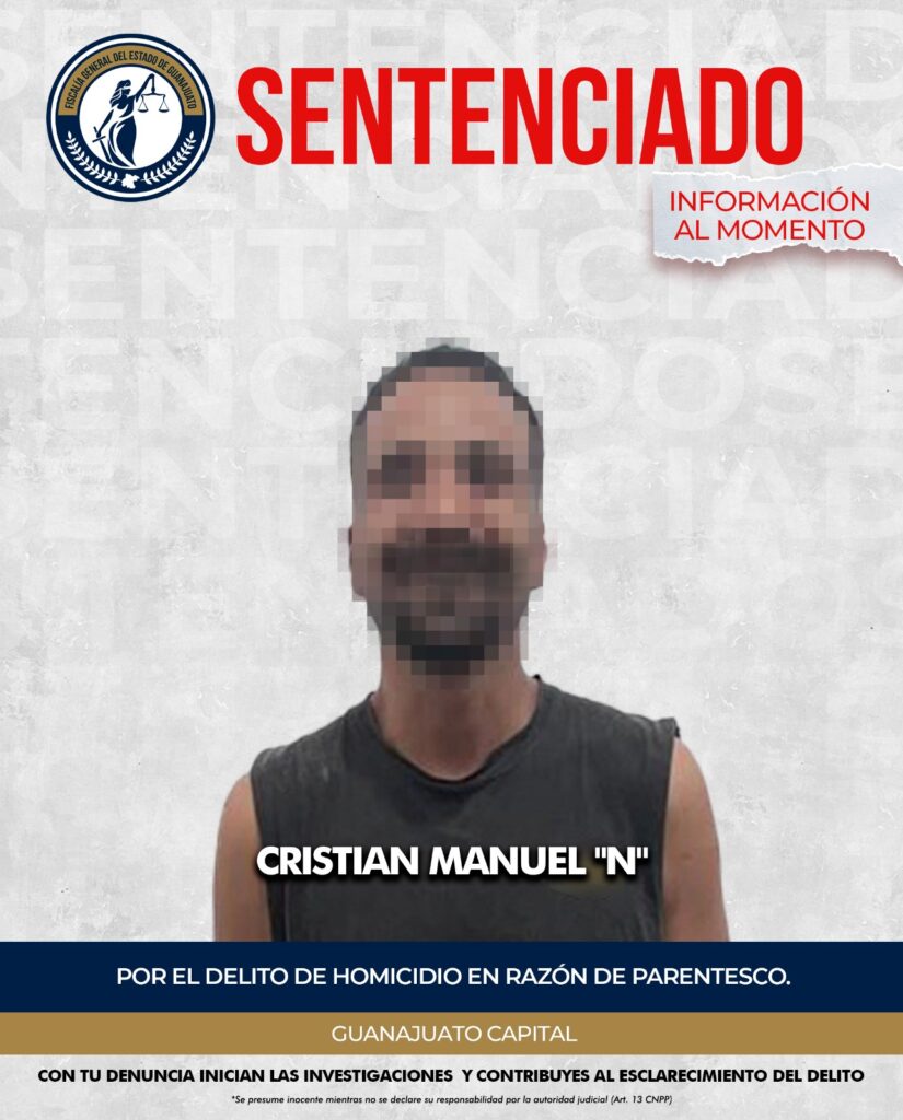 Guanajuato, Gto. La Fiscalía General del Estado obtuvo una sentencia condenatoria de 16 años y 8 meses de prisión en contra de CRISTIAN MANUEL “N”, tras acreditar su responsabilidad en el delito de homicidio en razón de parentesco. El sentenciado aceptó los cargos imputados por el Ministerio Público, lo que derivó en la resolución del caso mediante un procedimiento abreviado.