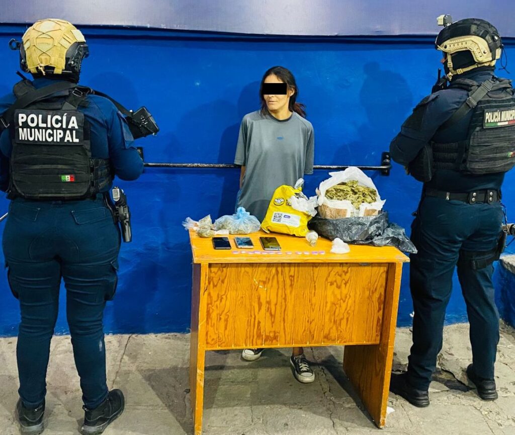 La mujer, quien portaba una mochila y una bolsa, intentó evadir a los oficiales pero fue alcanzada metros adelante. Conforme a protocolos y para descartar riesgos, se realizó una inspección preventiva y en la bolsa que portaba se encontró hierba verde y seca con características similares a la marihuana.